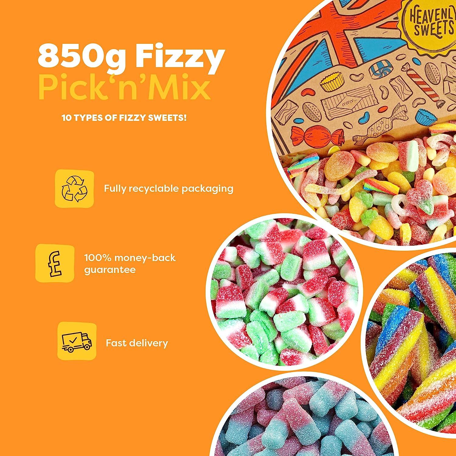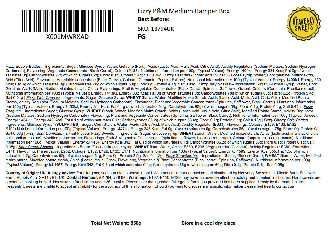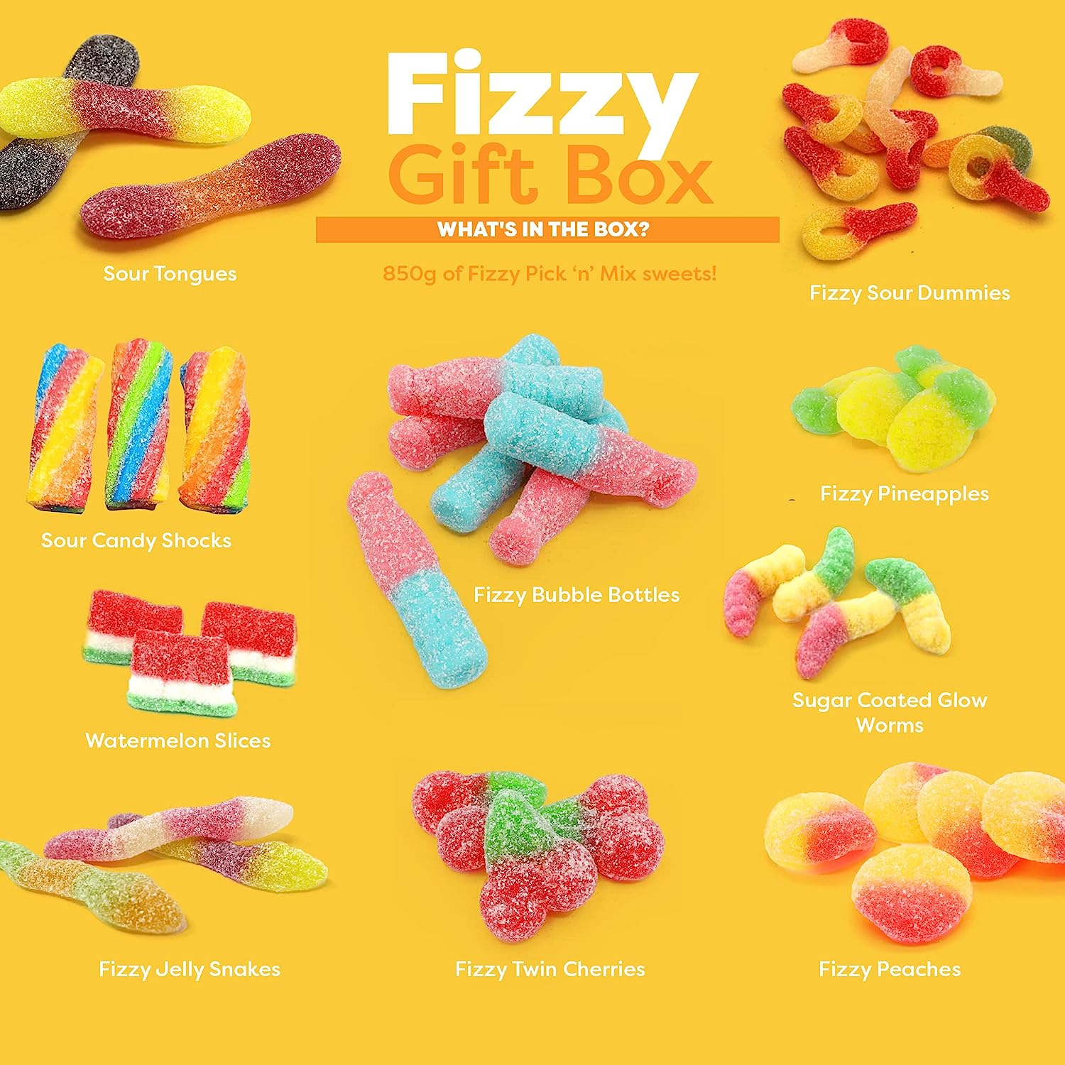 Our Pick & Mix Fizzy Sweets Box contains the following fizzy mix for you to pick: