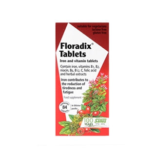 Floradix Iron & Vitamin Tablets contain iron (in the form of iron gluconate), vitamins B2, B6, B12 and C, which contribute to the reduction of tiredness and to normal energy yielding metabolism. Iron also contributes to normal red blood cell and haemoglobin formation.
