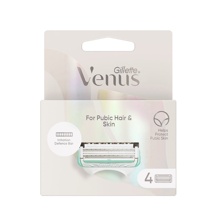 Specifically designed to help protect pubic skin from shave irritation. Venus pubic hair and skin razor blades have an advanced Irritation Defense Bar and optimally spaced blades that allow the blades to cut hair while barely touching the skin. Also, the razor blade refills come equipped with a precision trimmer on the back of the blades to help with tricky areas.