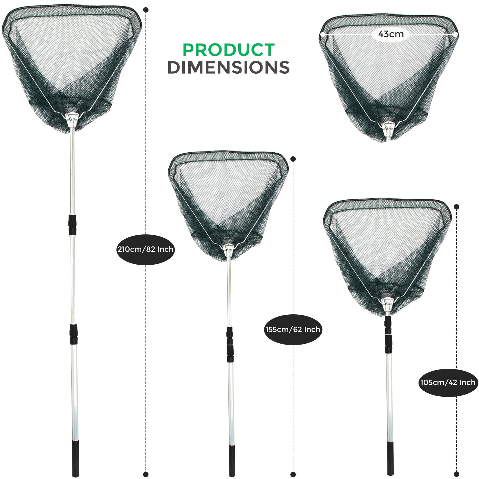 - 3-Section Telescoping Design- Total Length: 2.1m, Folded Length: 73cm; Net size: 43cm; Weight: 0.7 lbs; Maximum load capacity: 10lb. The telescoping pole has three extensions, adjust the length to your needs, it is suitable for sea fishing, river fishing, lake fishing, boat fishing, etc.