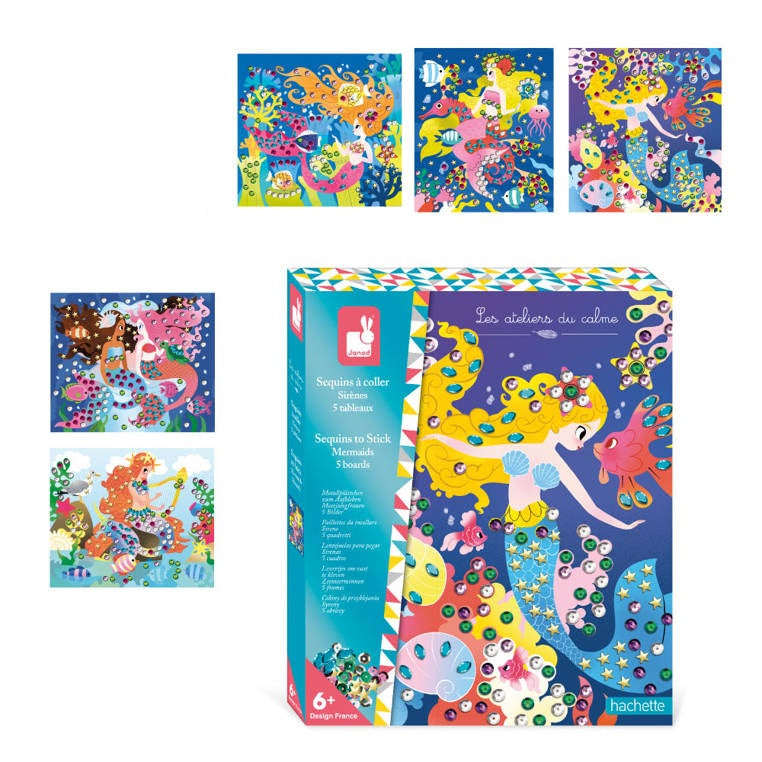 Under the ocean we go! This mermaid-themed craft set encourages children aged 6 and up to create 5 adhesive sequin pictures: a collage activity that combines precision with artistic flair. Mermaids, corals and sea creatures are waiting to shine! This craft set contains: 5 adhesive images, 800 sequins and 1 instruction booklet to help artists create. The multi-coloured domed sequins are ideal for developing little ones' concentration and logic.